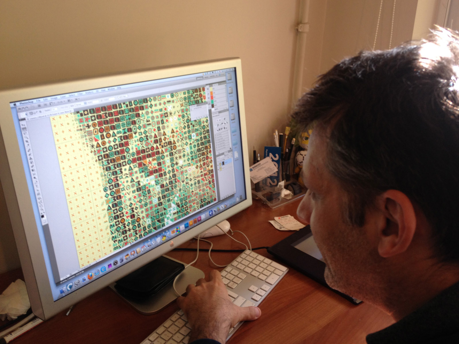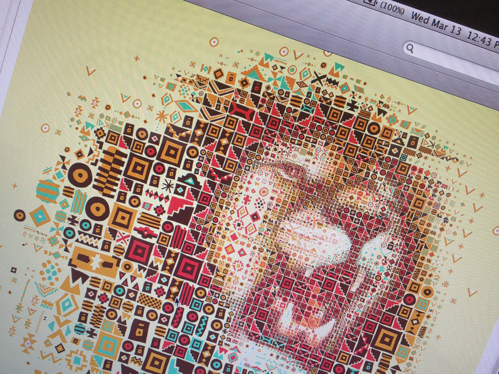 This is the part where Charis selects a portait, and in his mind first, magically deconstructs the photographic elements and reconstruncts them according to a grid and specific colour palette. The rest is slowly composed bit by bit, layer by layer, feature by feature.