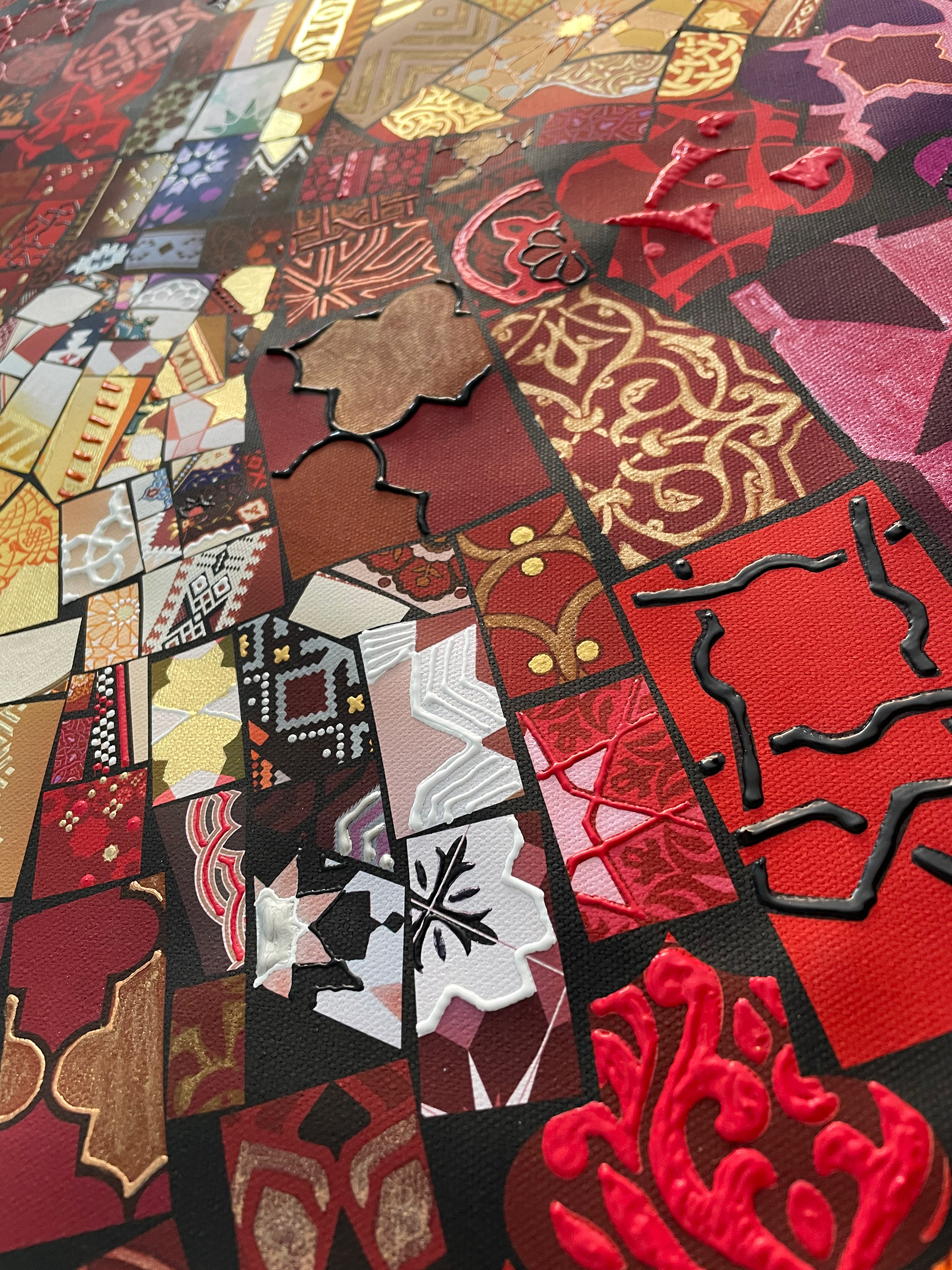 Combining acrylics and Relief Paint adds a profound dimensionality, breathing life into the paintbrush strokes with a captivating 3D effect. The crowning touch came with applying gold leaf (Giusto Manetti, Firenze Gold Leaf KTS 32 3/4 100x100 Th. 24gr Light pressed), enhancing specific details with a luminous charm that elevated the entire portrait to an extraordinary luxury.
