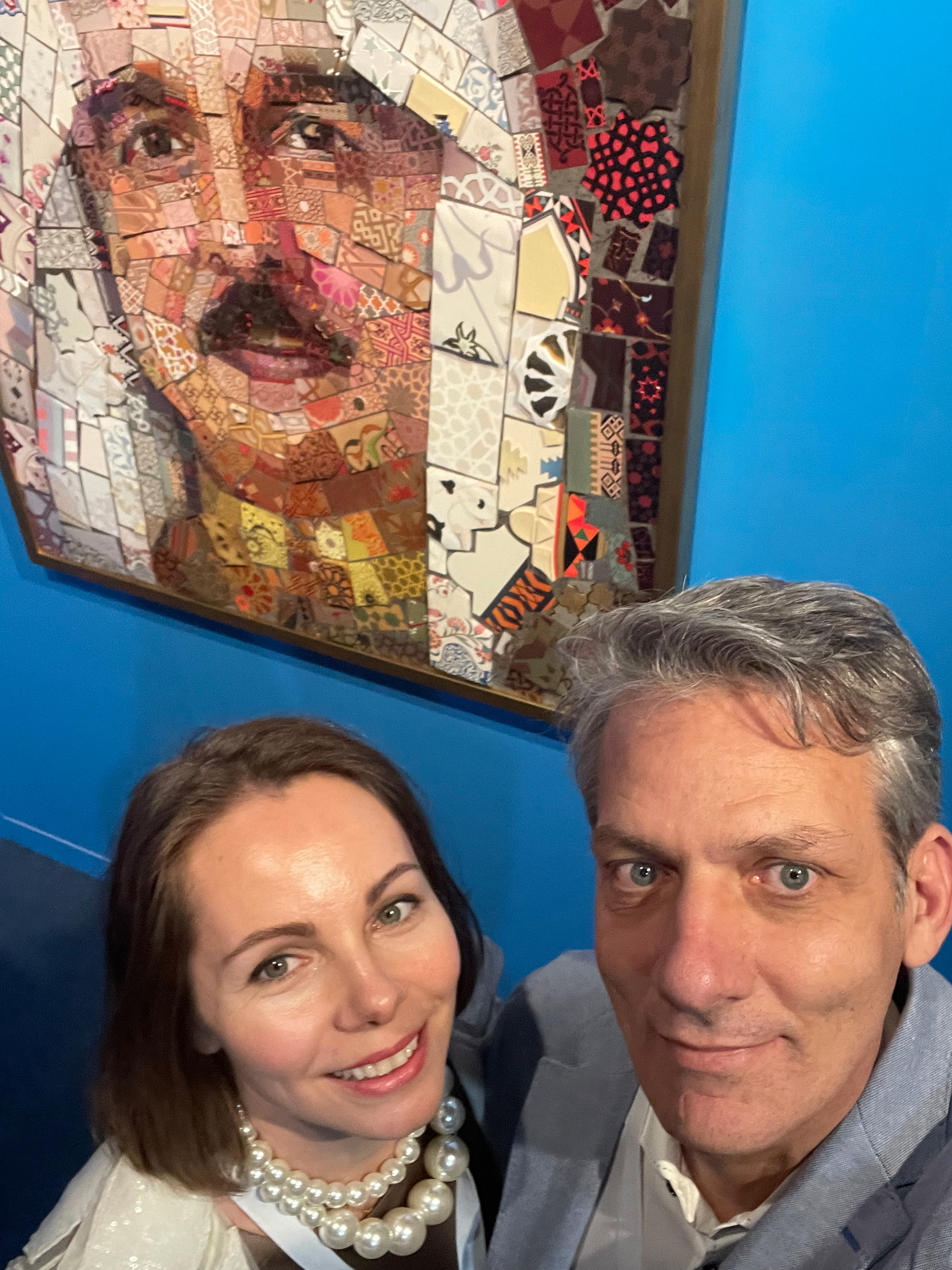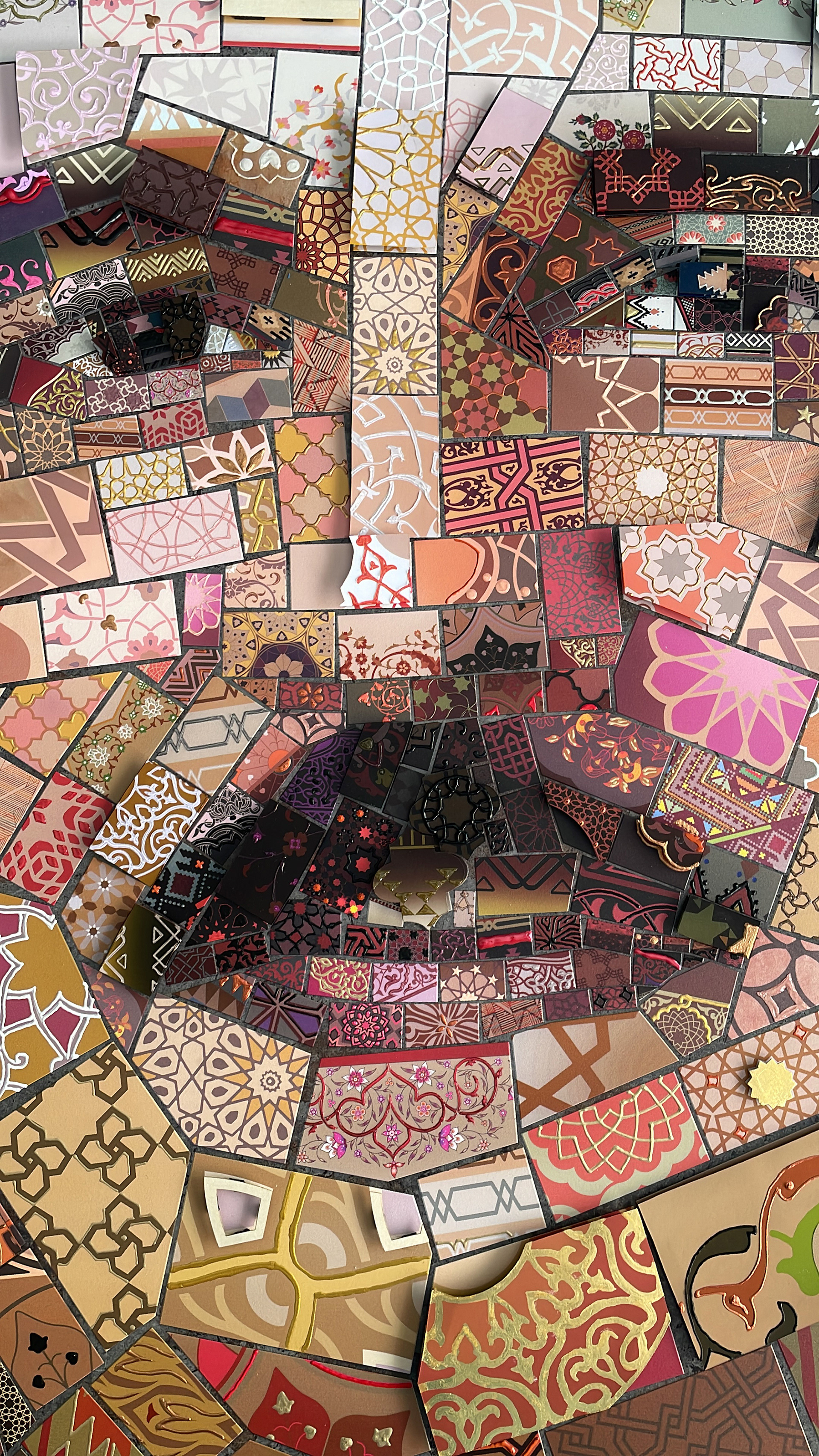 The creation process unfolded tirelessly with my wife Vira Konstanta and me immersed in the artistry of crafting a royal portrait. Every tile was meticulously cut and hand-painted, with additional tiles crafted from metallic art paper using a laser-cut machine. As each piece found its place in this mosaic symphony, the assembly reached new heights, creating a visual crescendo.