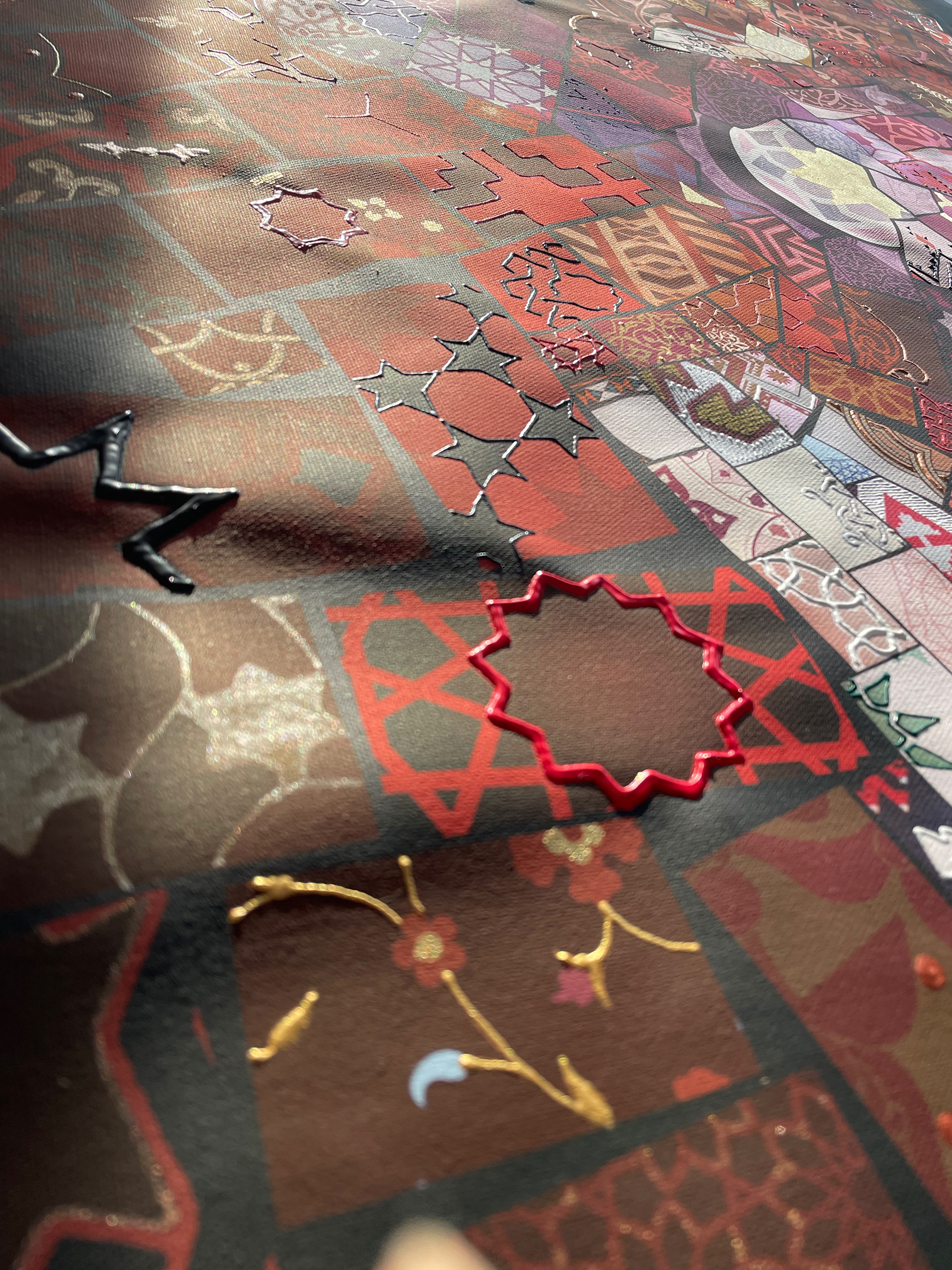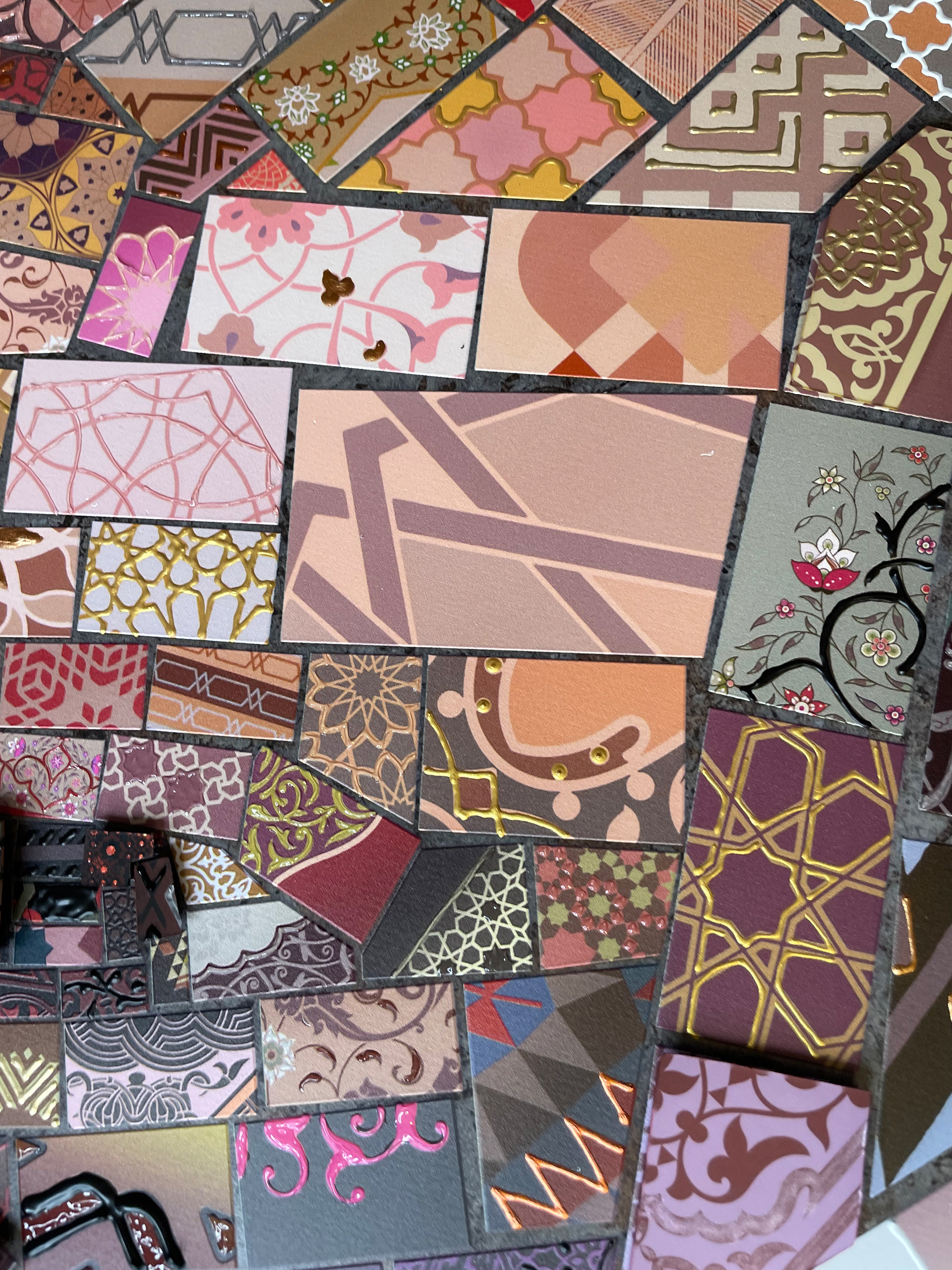 This approach ensured that each stroke and detail echoed the essence of the creatures portrayed. Relief Paint and metallic colors add a dimension of 3D allure. At the same time, strategic elements were adorned with the luminescence of gold leaf (Giusto Manetti, Firenze Gold Leaf KTS 32 3/4 100x100 Th. 24gr Light pressed.), casting an enchanting charm on the mosaic. The result is not merely a representation; it's a crafted symphony that captures the spirit of the wild in every individual tile, a harmonious blend of technology and hands-on artistry.