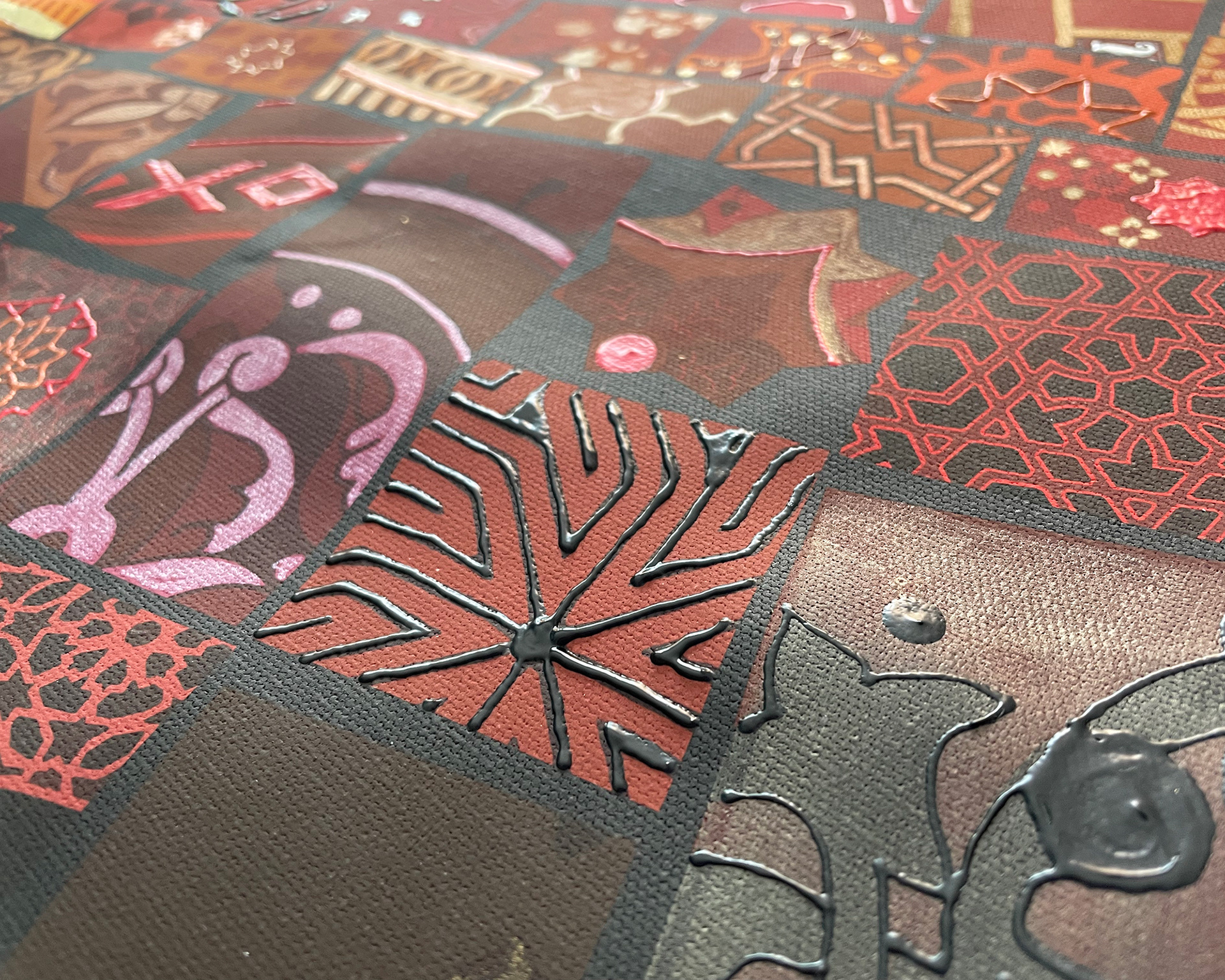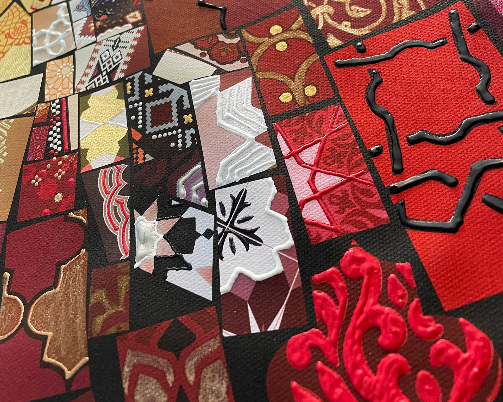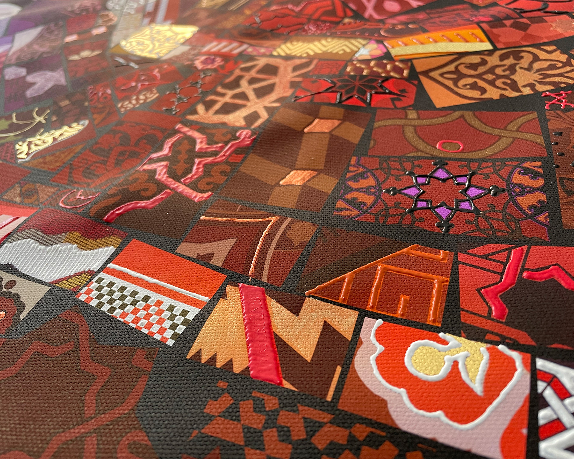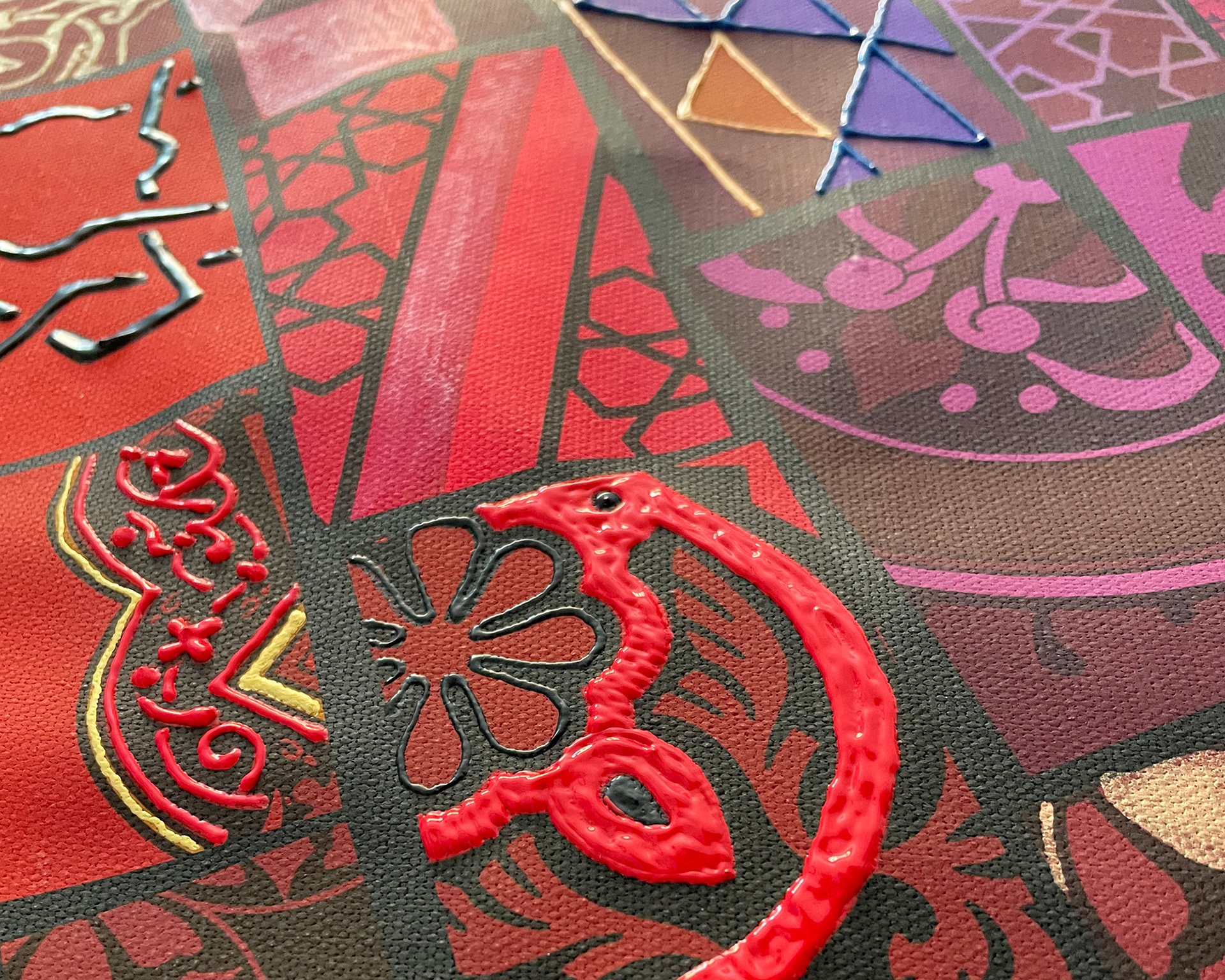 Dimensional Development: Acrylics and Relief Paint created three-dimensional effects that brought the portrait to life, while Giusto Manetti Gold leaf (KTS 32 3/4 100x100 Th. 24gr Light pressed) provided the luminous quality traditionally associated with royal portraiture across cultures.