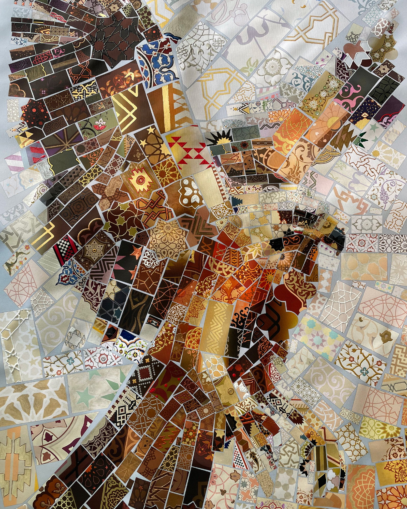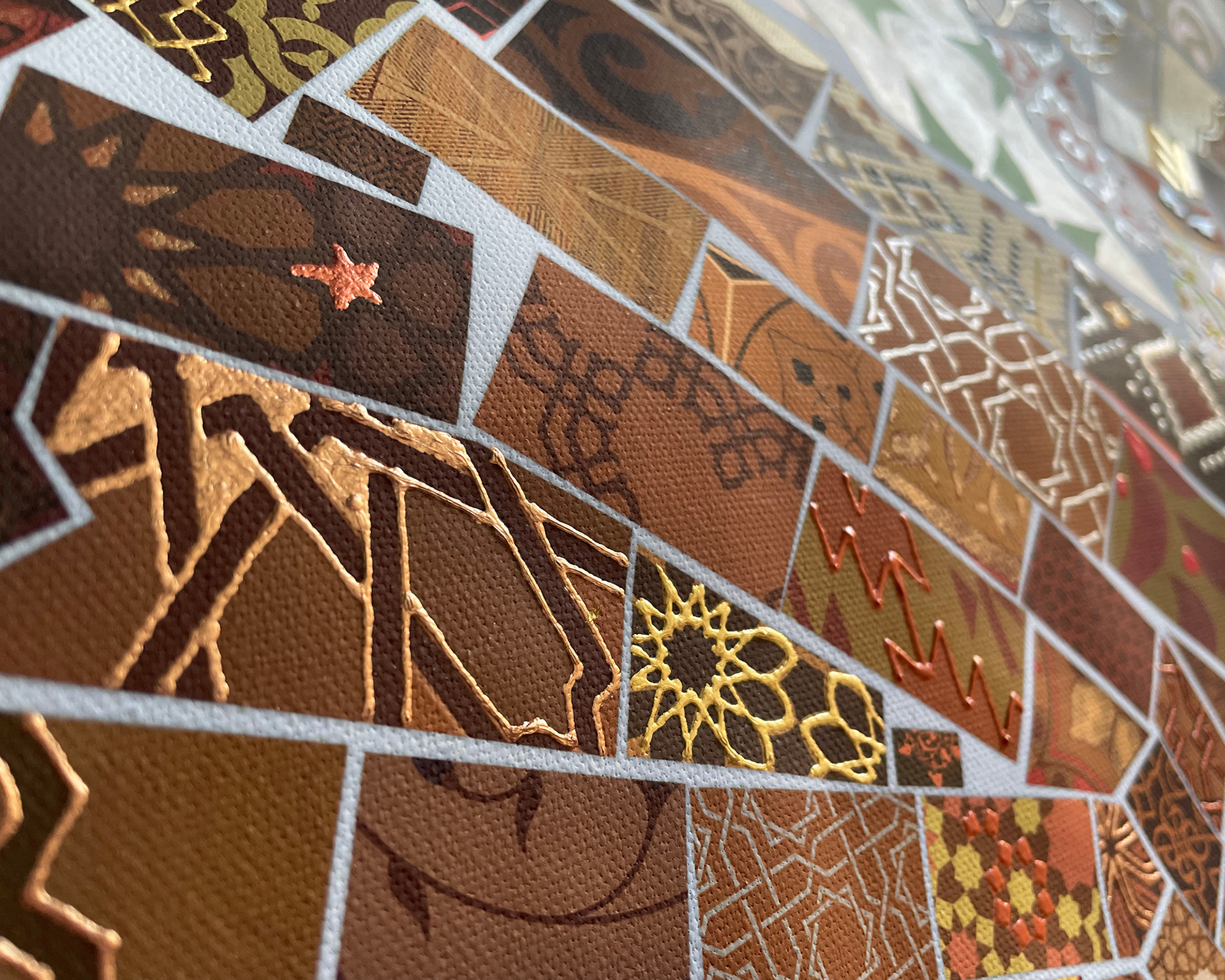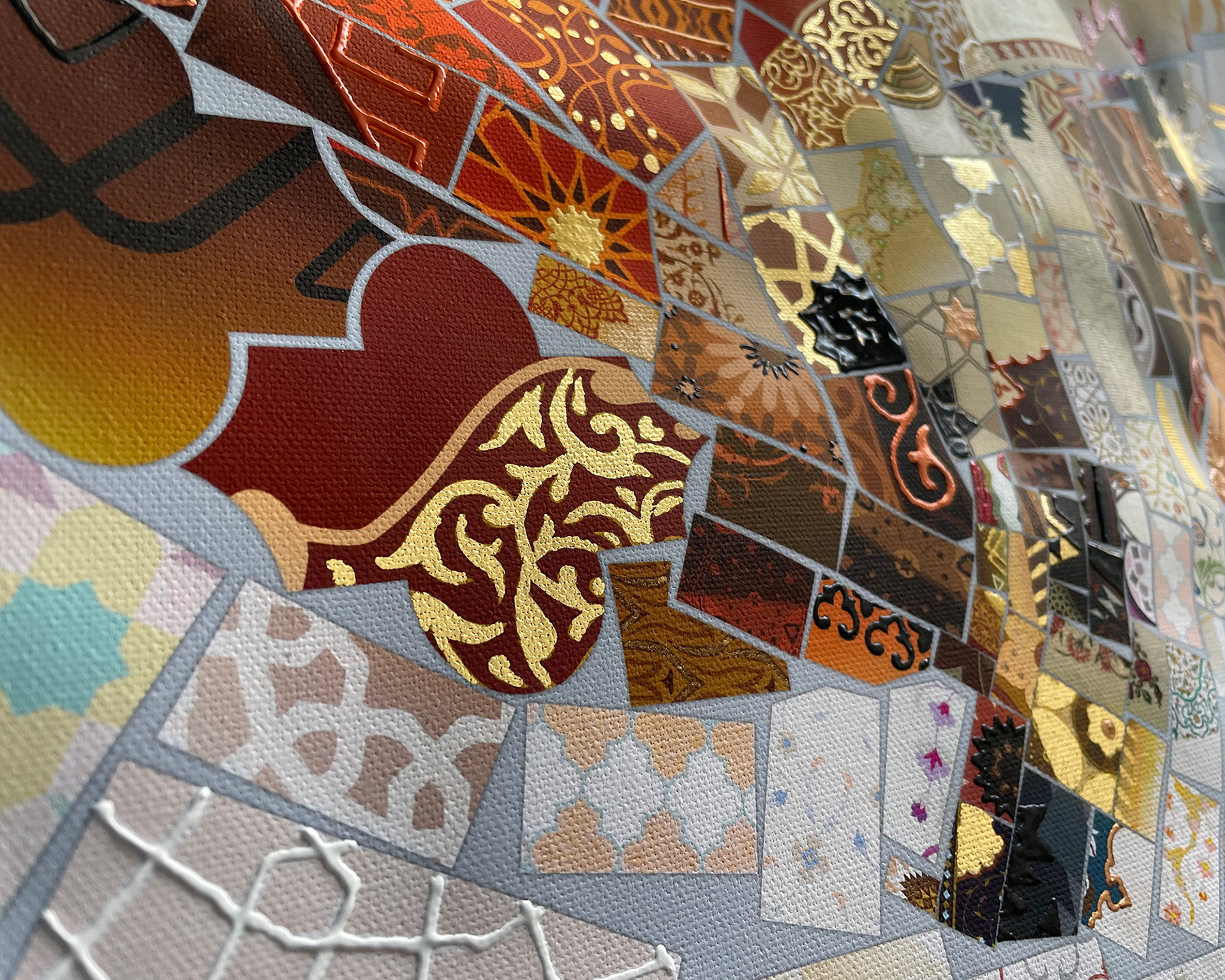 The Hand Process: Here, ancient craftsmanship met contemporary technique. Each tile in the second layer was individually hand-cut and hand-painted, with metallic art paper details created through laser-cutting technology. This hybrid approach allowed for the precision required by Islamic geometric principles while maintaining the individual character essential to portraiture.