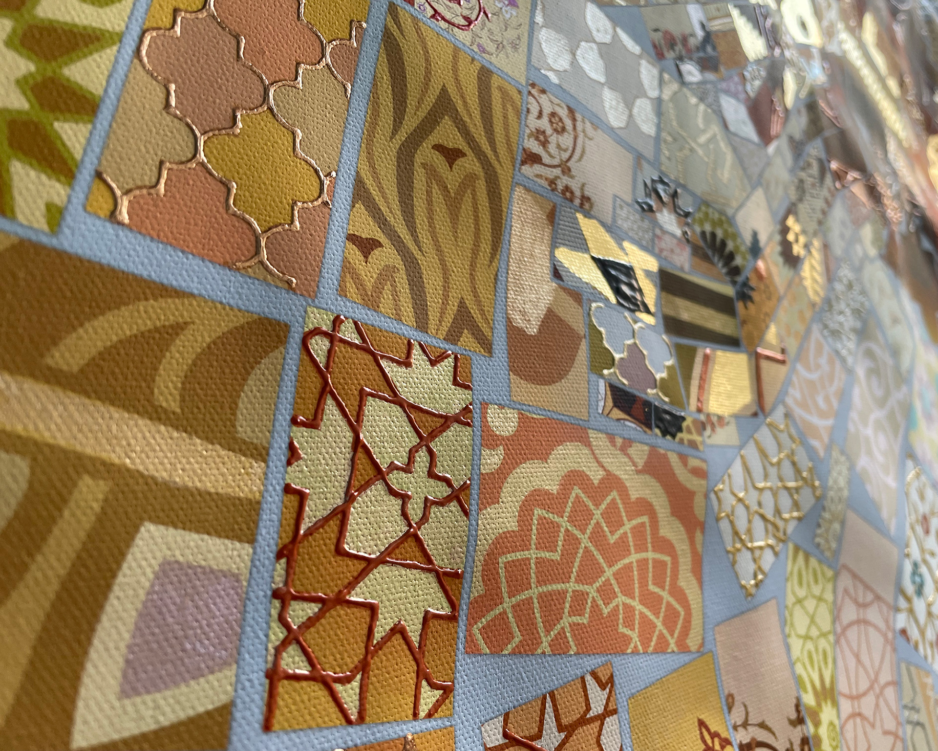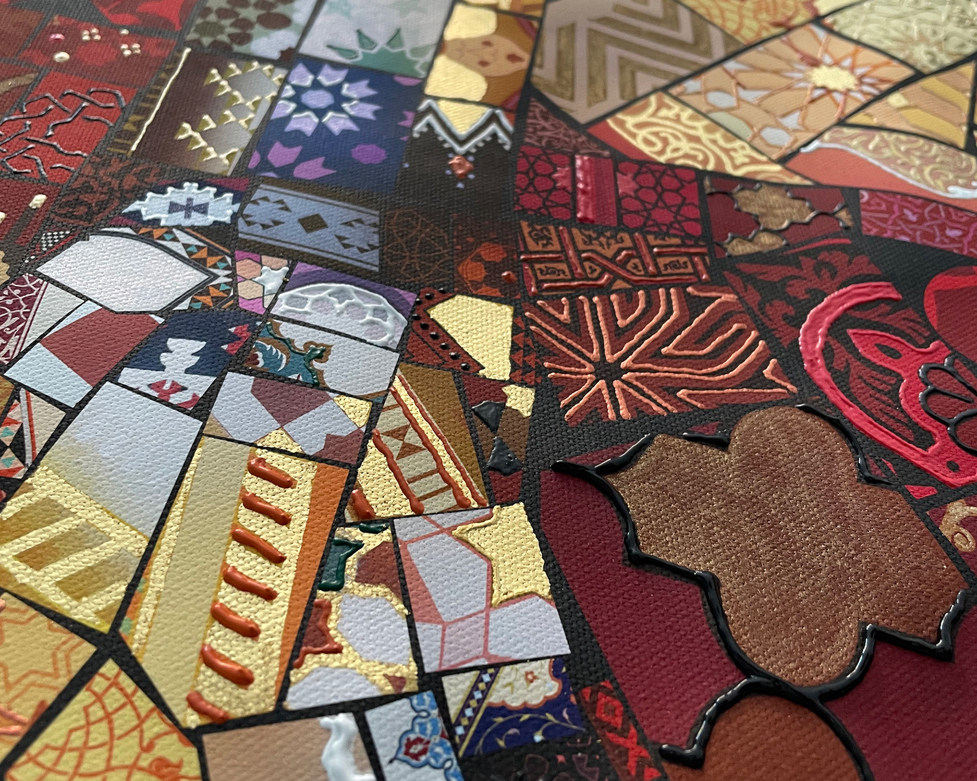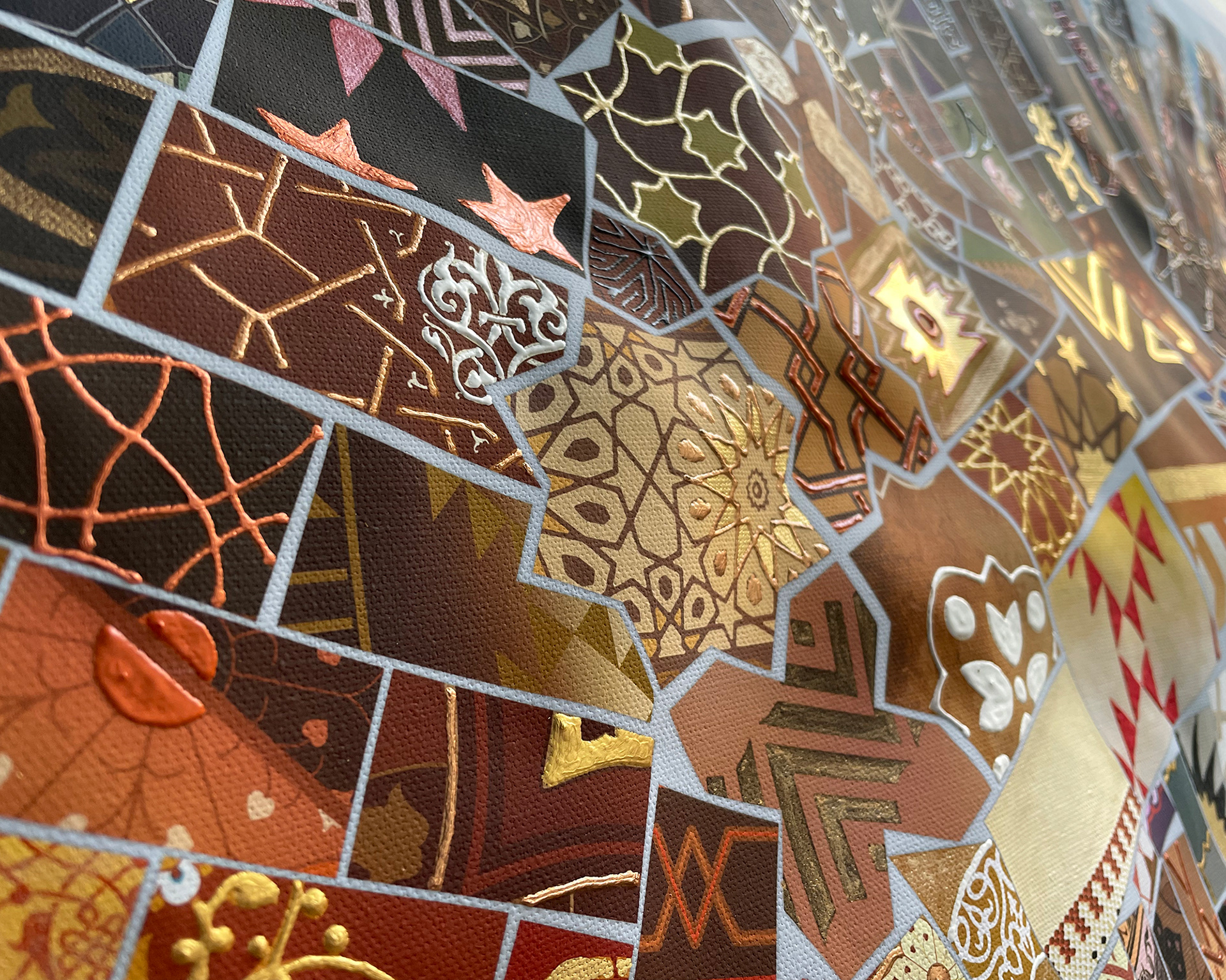 The Hand Process: Here, ancient craftsmanship met contemporary technique. Each tile in the second layer was individually hand-cut and hand-painted, with metallic art paper details created through laser-cutting technology. This hybrid approach allowed for the precision required by Islamic geometric principles while maintaining the individual character essential to portraiture.