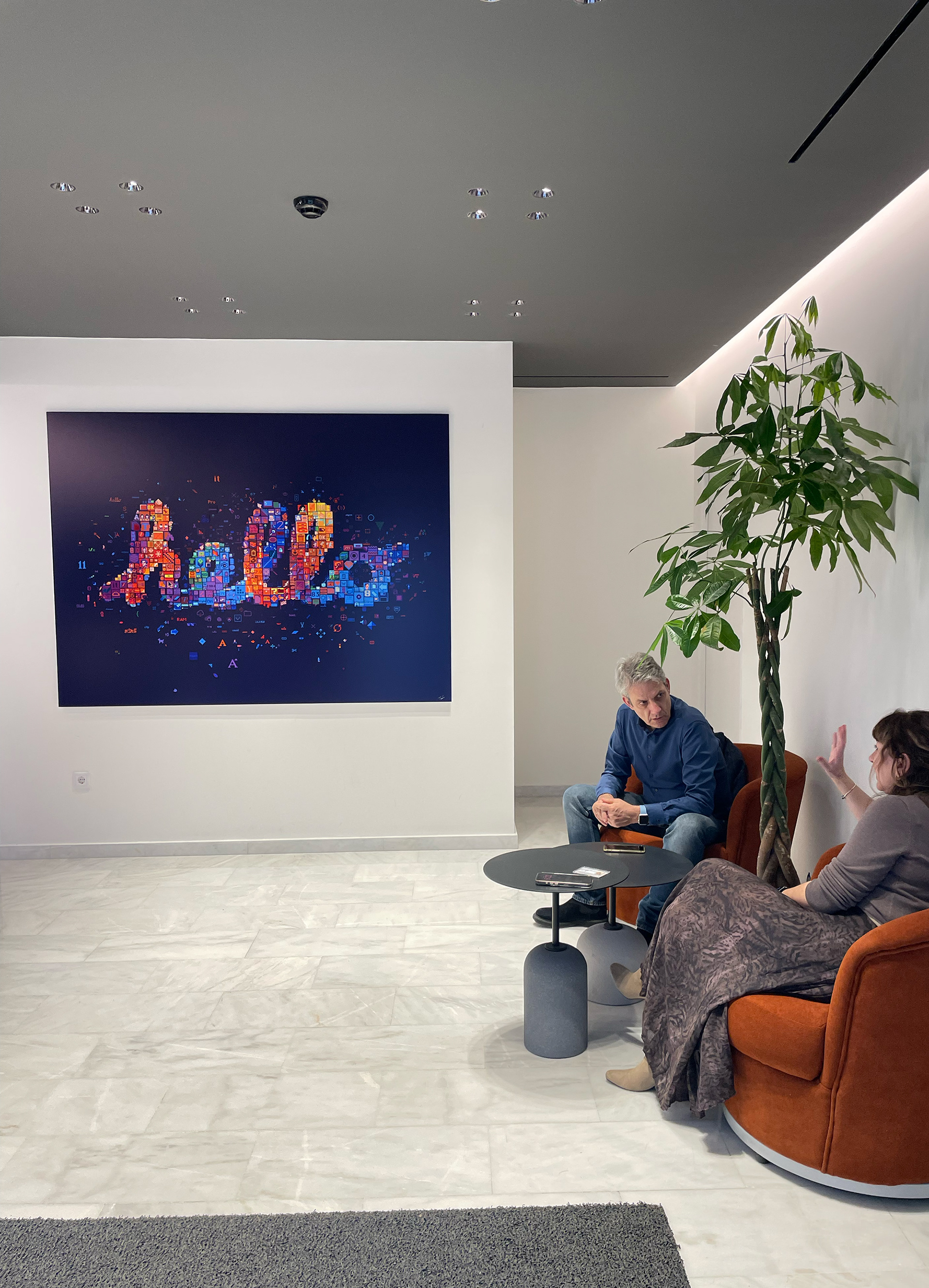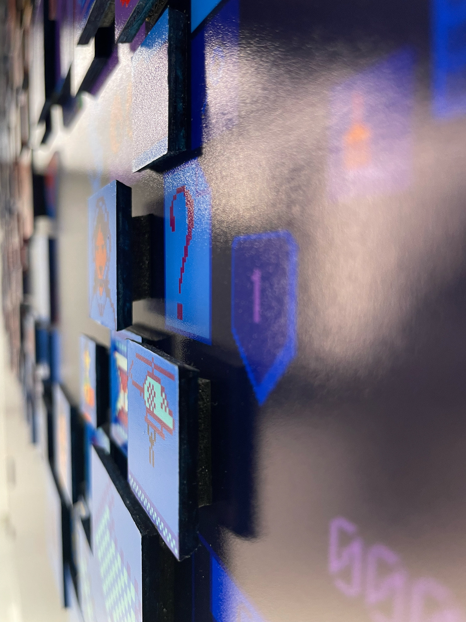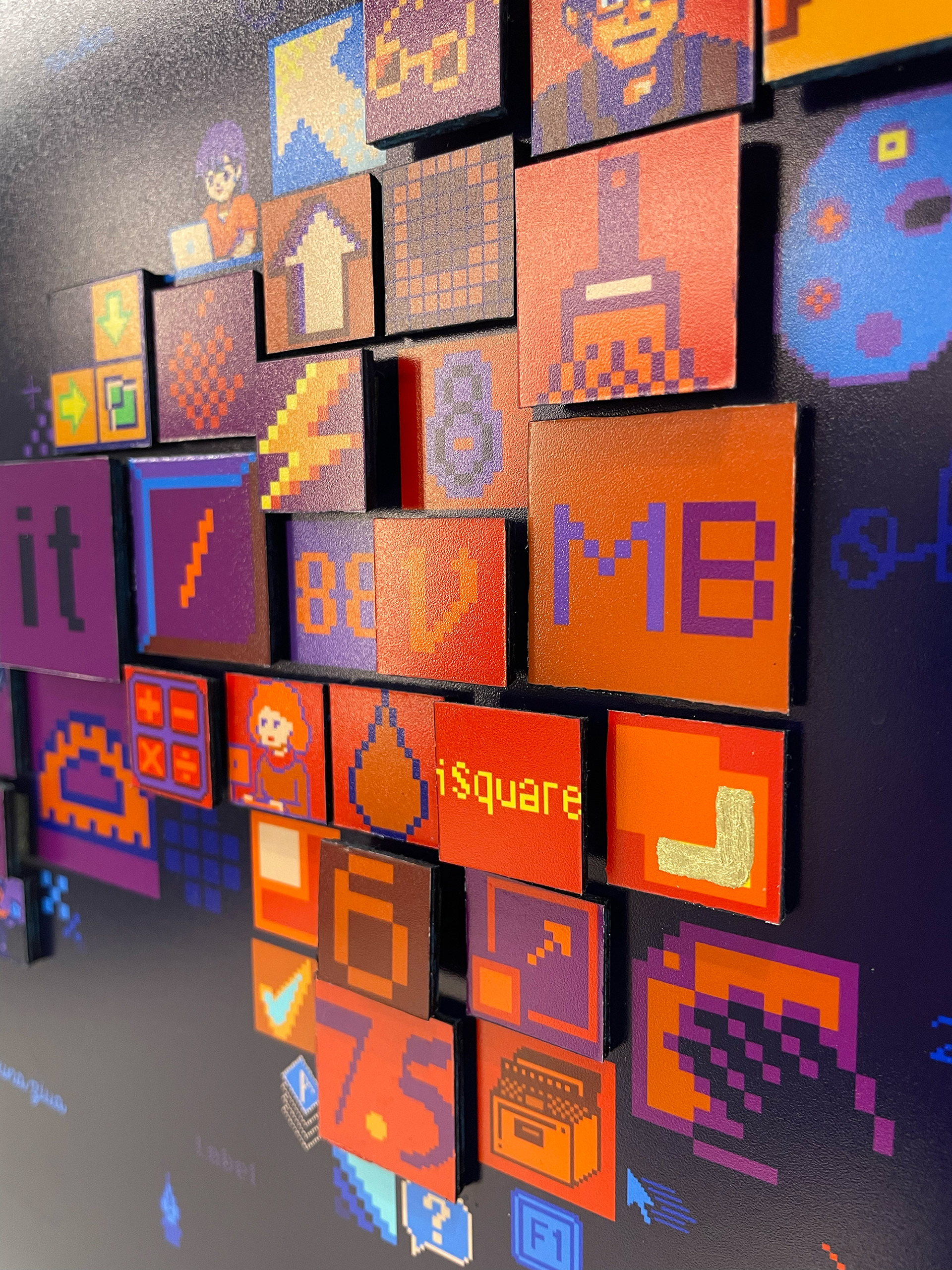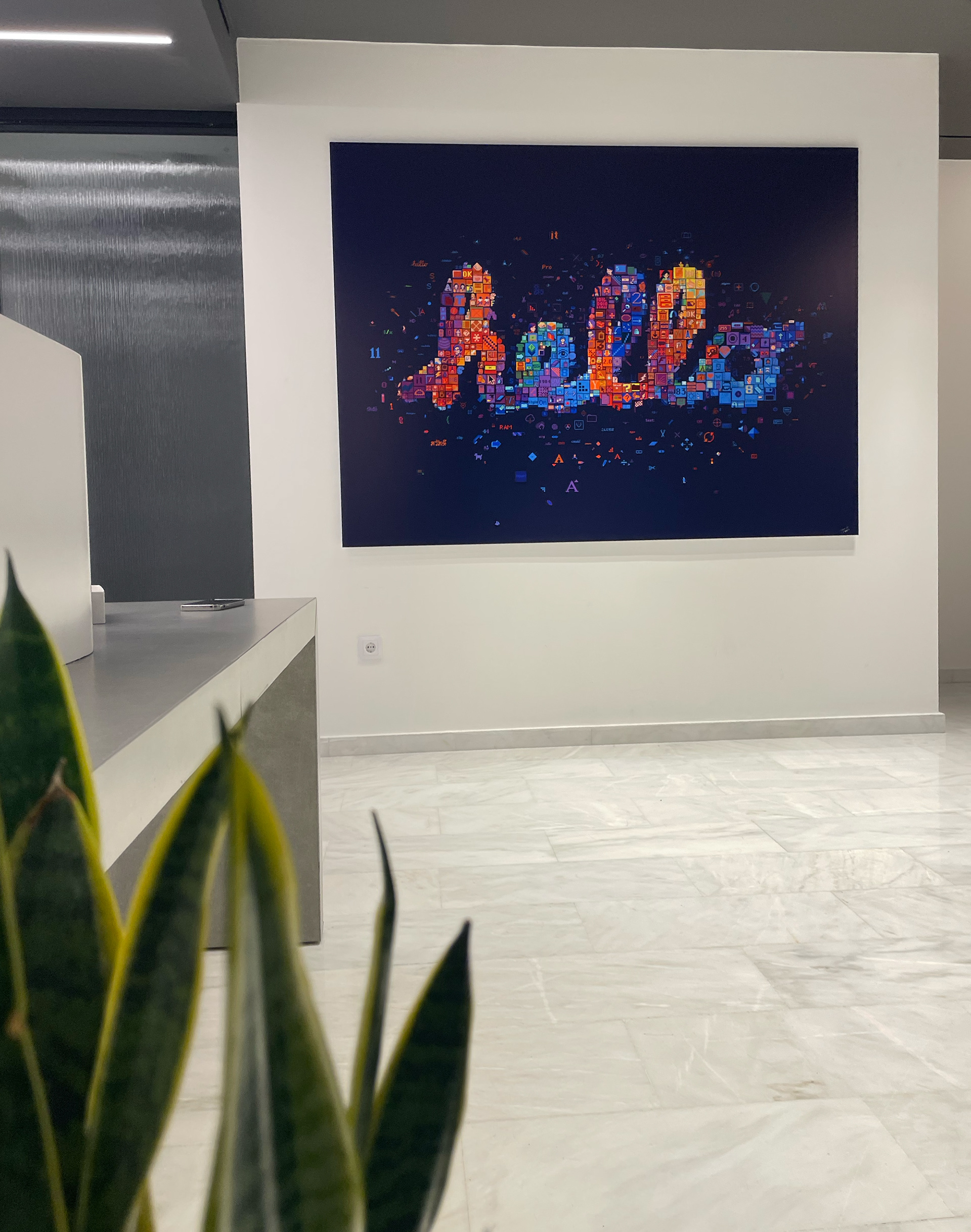 This custom digital mosaic was commissioned by iSquare S.A. for its updated headquarters as a tribute to its technological legacy. The artwork spells out "HELLO" using interface elements from four decades of Apple's history, including colorized Susan Kare's iconic icons, Apple II references, and modern iSquare service elements. Created as a centerpiece for the space, it embodies the personal connection between the artist and Apple since the mid-80s. The piece combines digital artistry with analog finishing techniques to create a multi-dimensional tribute that plays with light and invites viewers to engage with Apple's history.