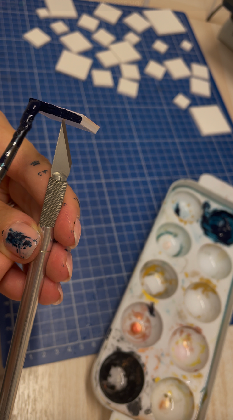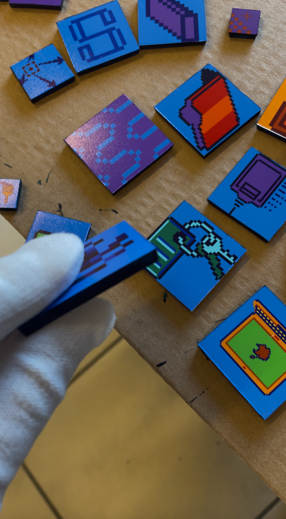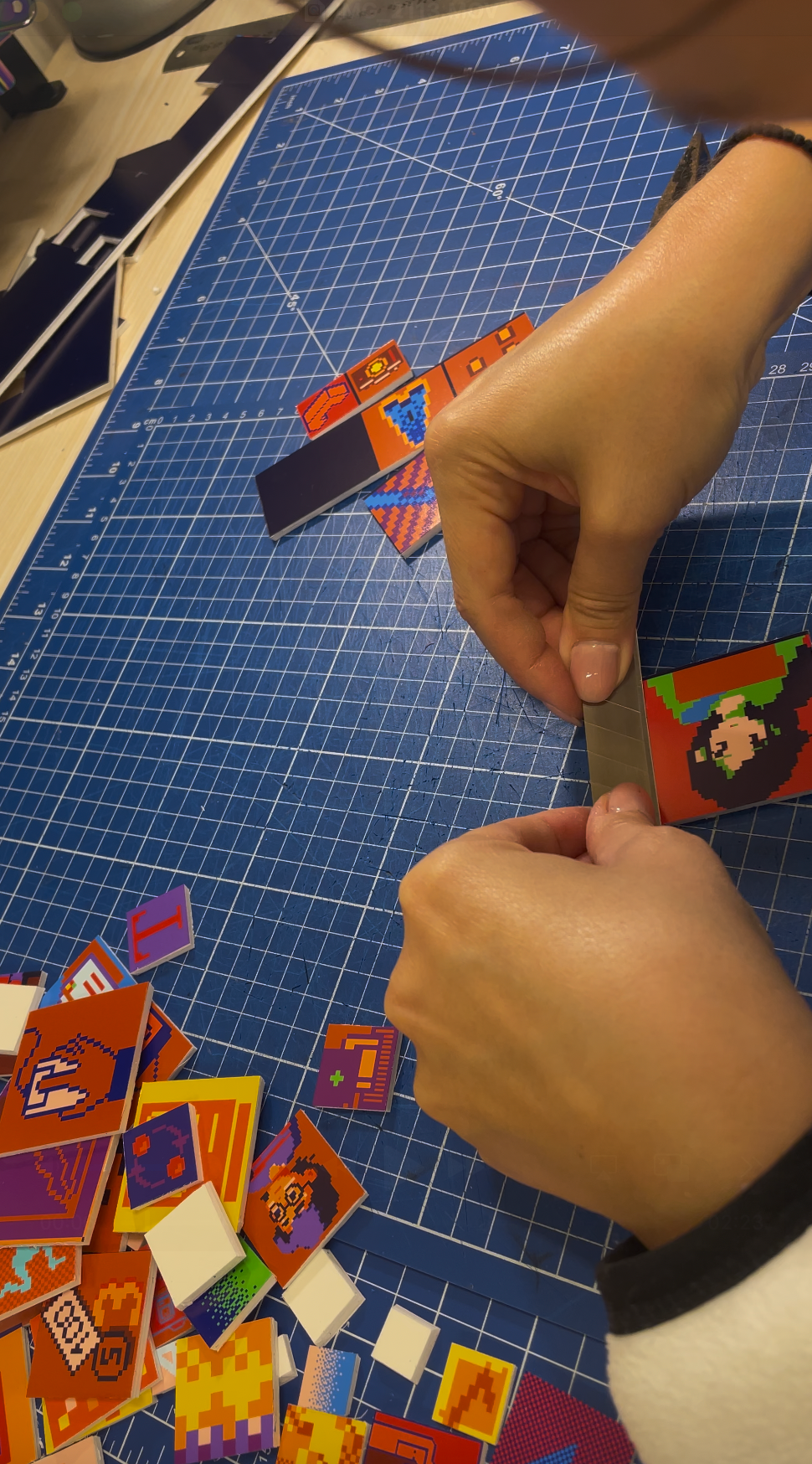 To make it physical, we used a 12-color giclee print on special paper. Then the hands-on work started. Vera, my wife and precious collaborator with a real passion for everything analog, carefully finished the piece by cutting, layering, and painting the edges to give it three-dimensional depth. With different varnishes, metallic pigments, and foils, the pixels seem to come alive.