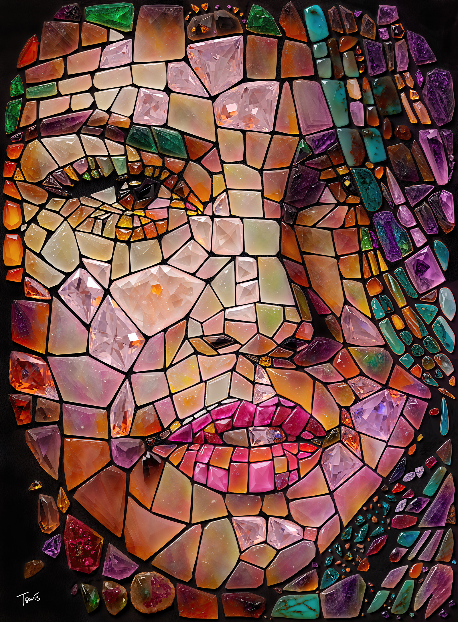 This style combines a stunning display of meticulously crafted precious stones, pearls, and gems to form a unique mosaic. With a diverse array of tens of different gemstones, each mosaic reflects the essence and influence of remarkable individuals.
