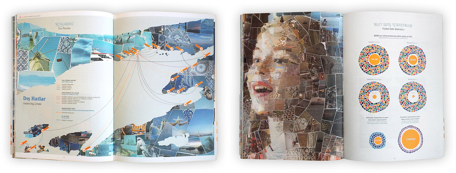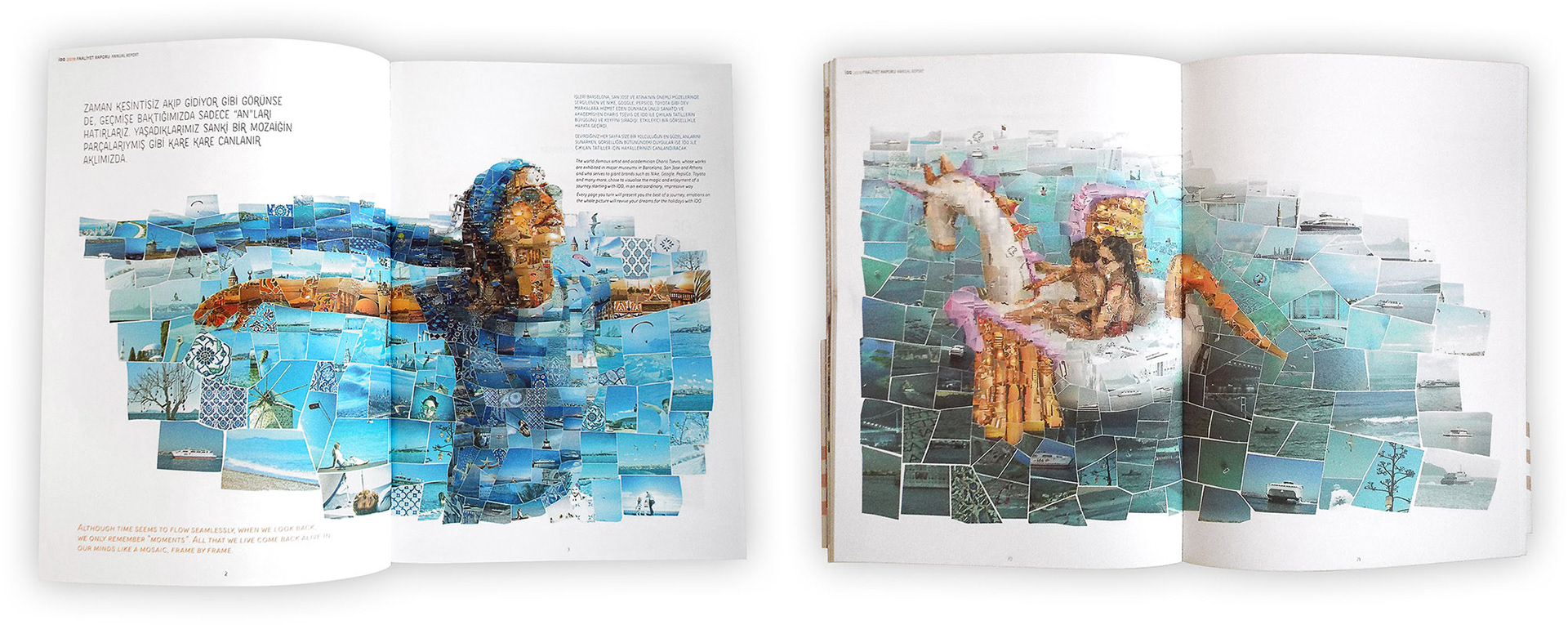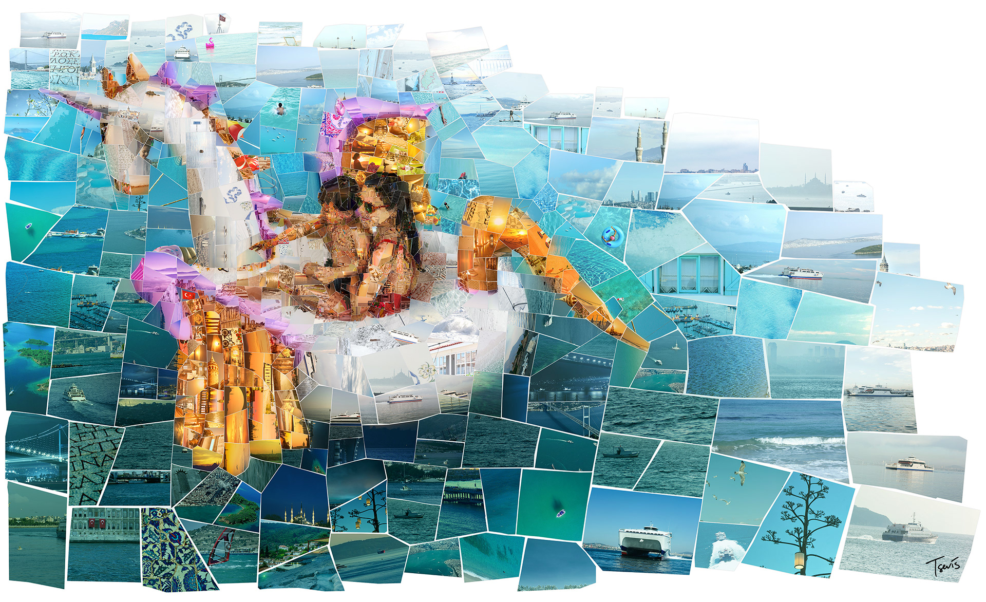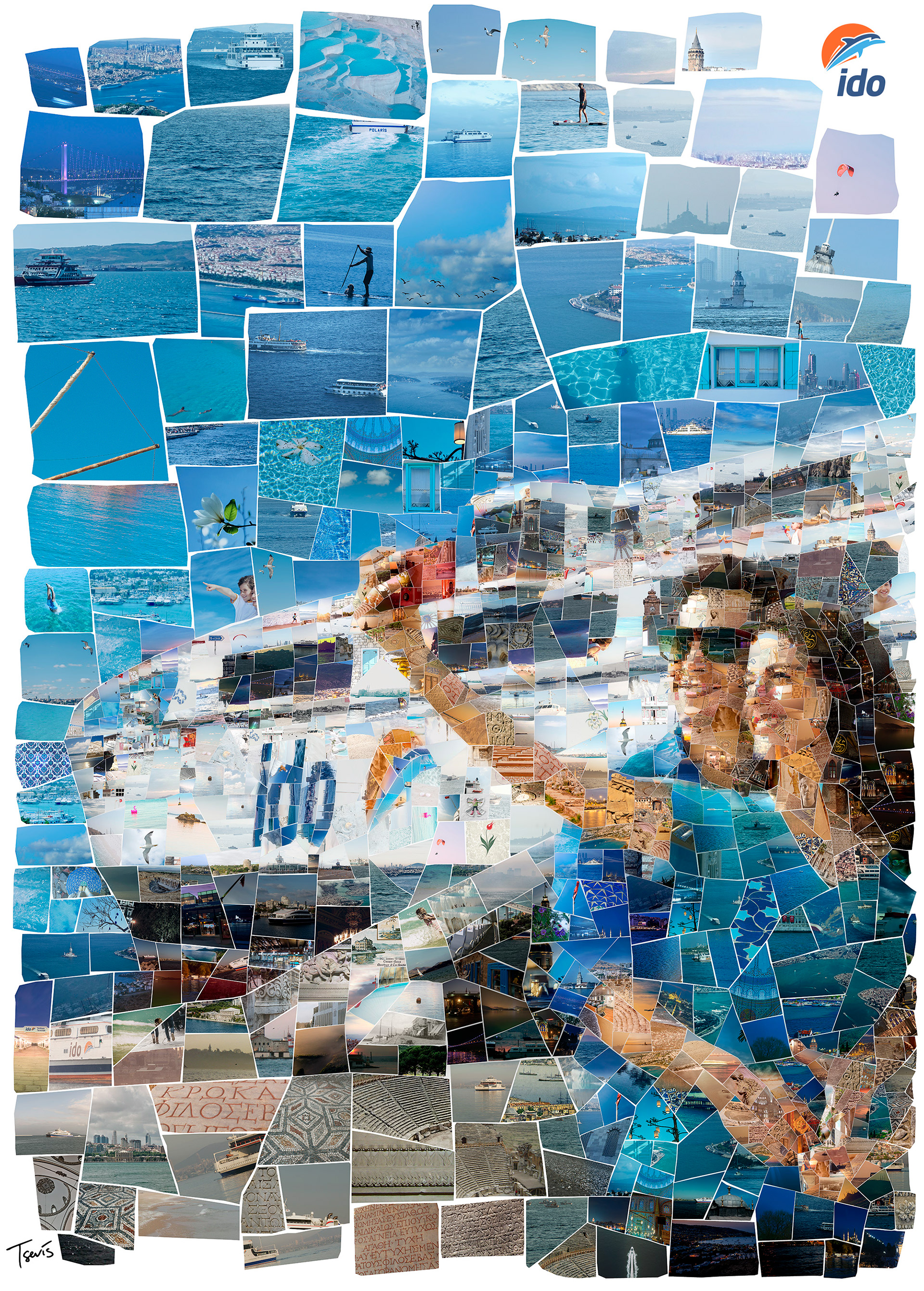 I have been commissioned by Graffiti Istanbul, the multi-awarded design firm based in the Turkish metropolis, to create a series of mosaic illustrations for İDO. We had to build mosaics of travel and holiday scenes made out of photos from all ports and cities İDO is connecting with Istanbul. These illustrations would be used in the Annual Report of the company as well as for some decoration purposes.