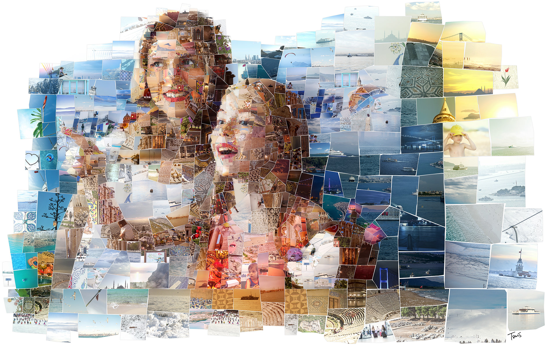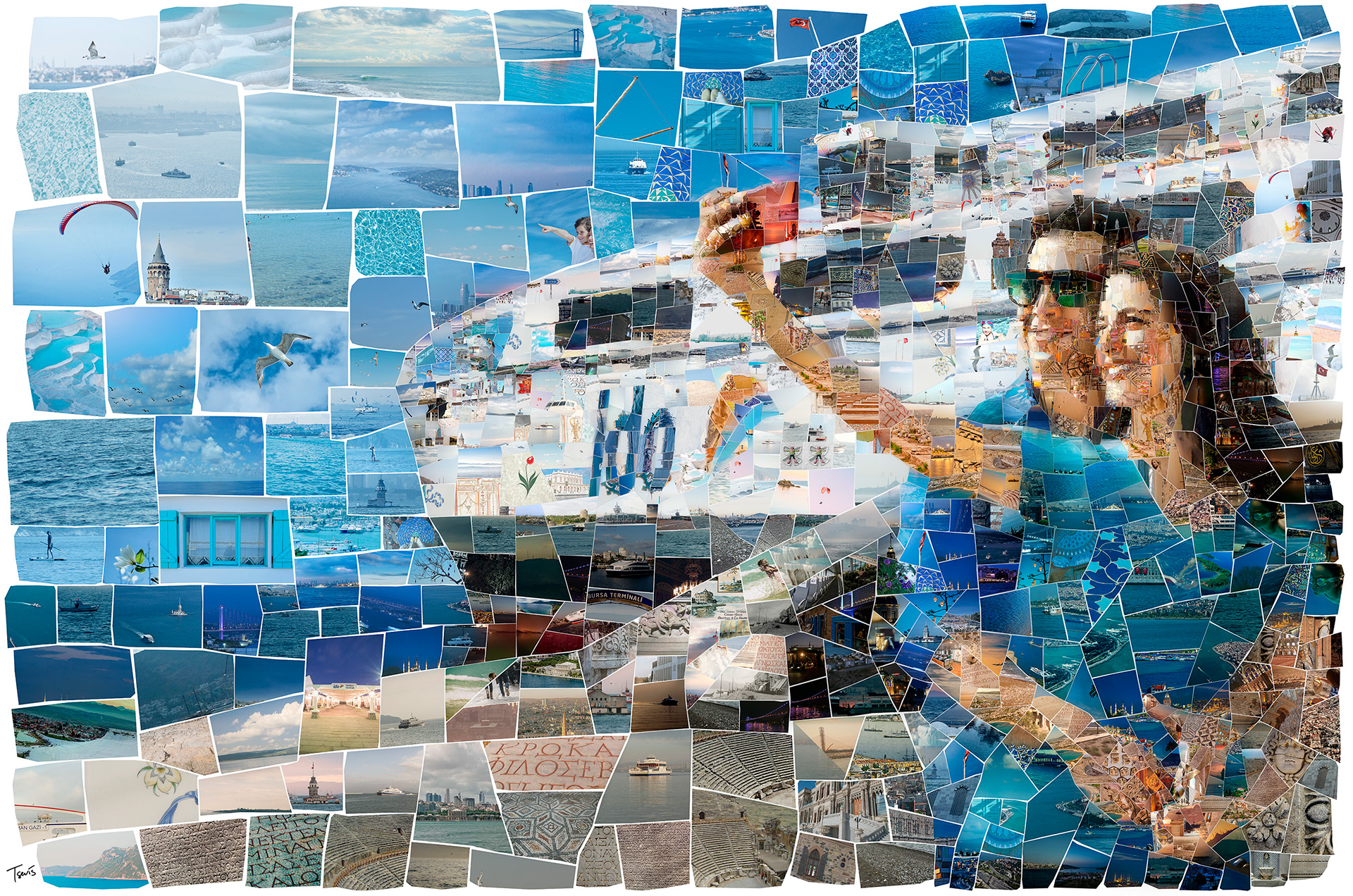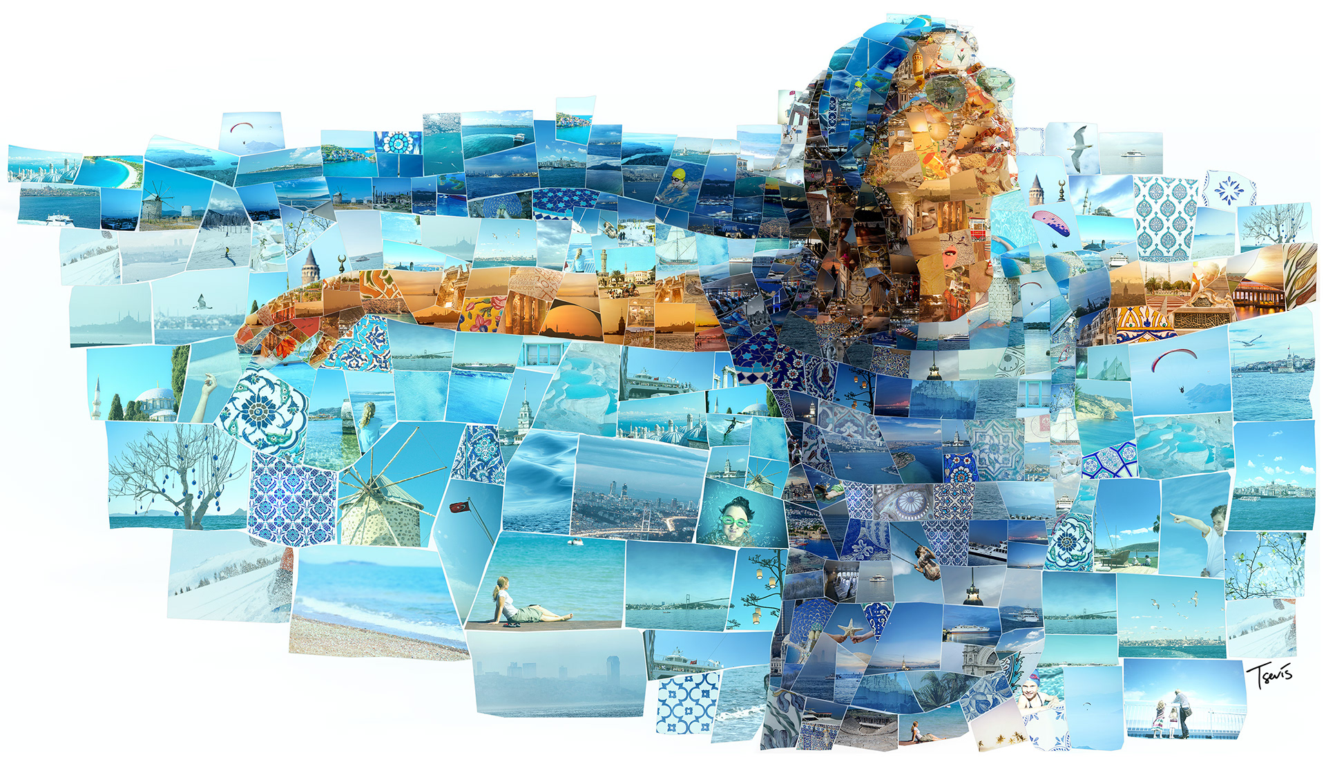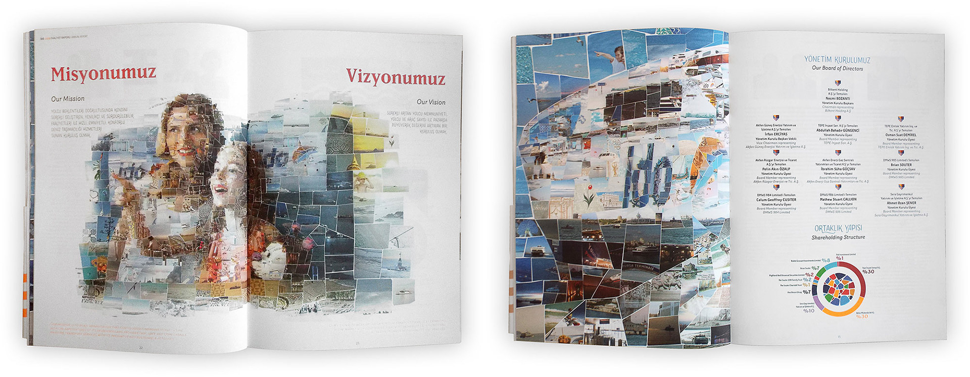 I have been commissioned by Graffiti Istanbul, the multi-awarded design firm based in the Turkish metropolis, to create a series of mosaic illustrations for İDO. We had to build mosaics of travel and holiday scenes made out of photos from all ports and cities İDO is connecting with Istanbul. These illustrations would be used in the Annual Report of the company as well as for some decoration purposes.