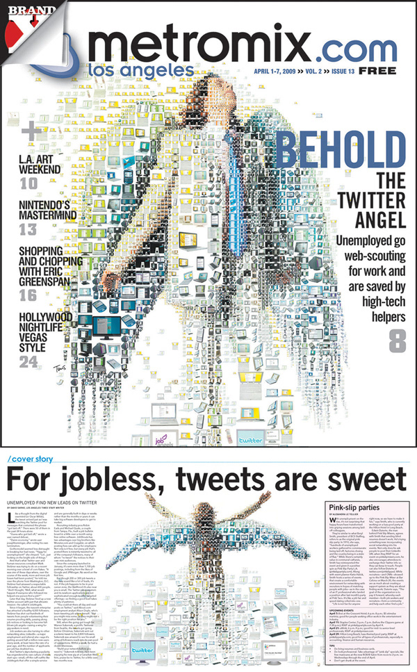 Twitter Angels is a term born on the 2008 financial crisis era. These "angels" were simple Twitter users twitting job listings and helping unemployed people to find employment opportunities. Two mosaics were created showing a businessman with angel wings made out of computers, monitors, smart phones and twits.